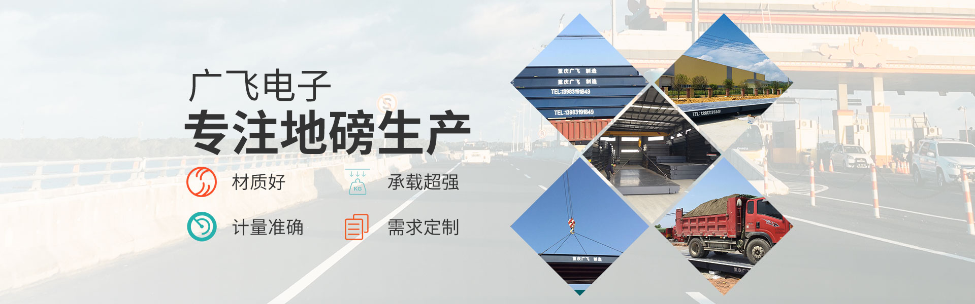 重慶廣飛電子有限公司,是一家集衡器生產(chǎn)、技術(shù)研發(fā)、產(chǎn)品銷(xiāo)售及售后服務(wù)于一體的高科技企業(yè)。 產(chǎn)品囊括電子汽車(chē)衡(電子地磅)、無(wú)人值守地磅稱(chēng)重管理系統(tǒng)、電子地上衡、智能稱(chēng)重管理系統(tǒng)、電子軌道衡、電子吊秤、電子臺(tái)秤、電子皮帶秤、鏟車(chē)秤、公路超載超限系統(tǒng)等全系列稱(chēng)重產(chǎn)品。